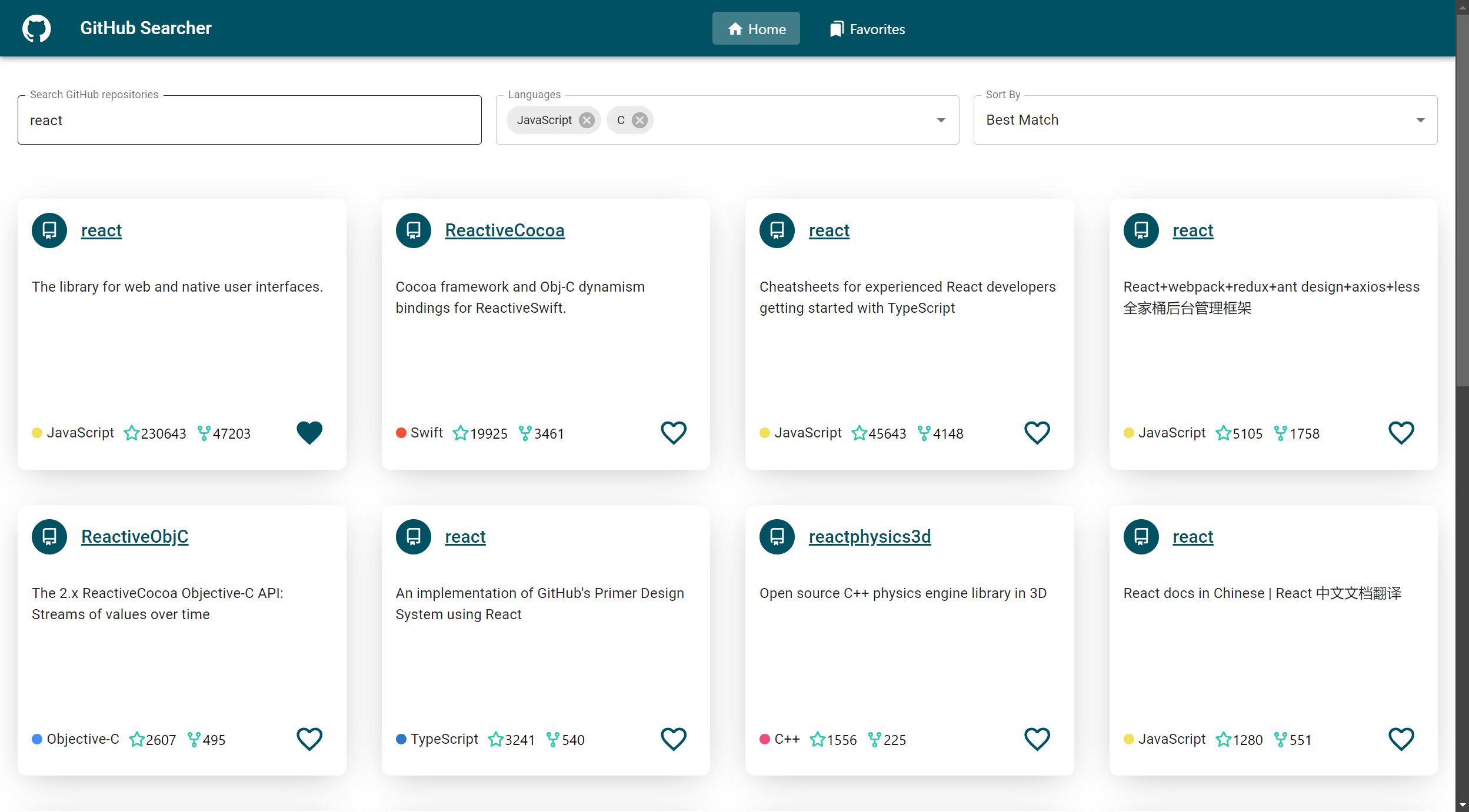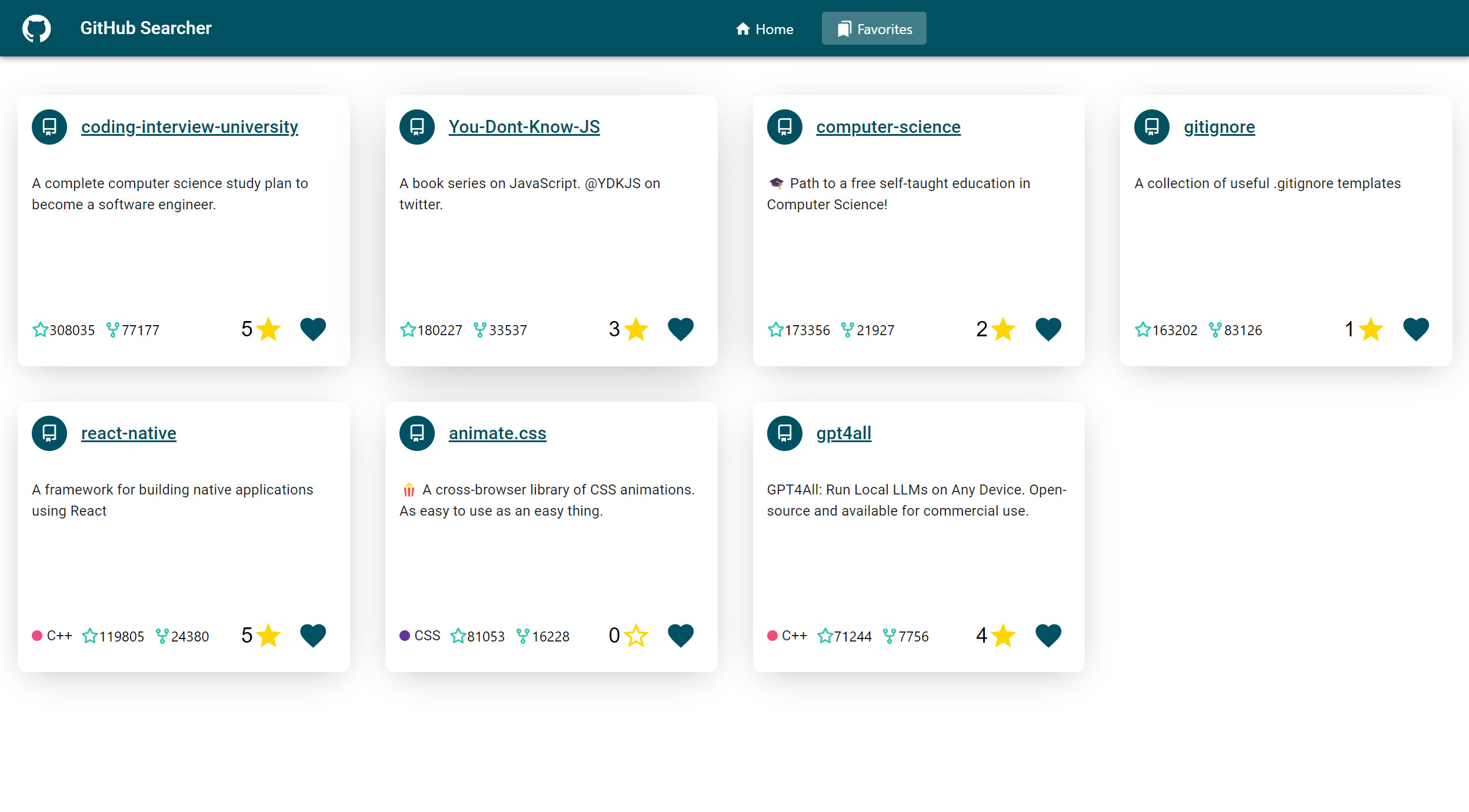 Application React permettant de rechercher des dépôts GitHub avec une interface dynamique et réactive. Intégration du scroll infini et d’une recherche avec délai (debounce), filtres, favoris et système de notation. Les résultats sont récupérés en temps réel, avec chargement continu lors du défilement. Les favoris sont consultables et gérables pour une interaction fluide avec l’écosystème GitHub.
