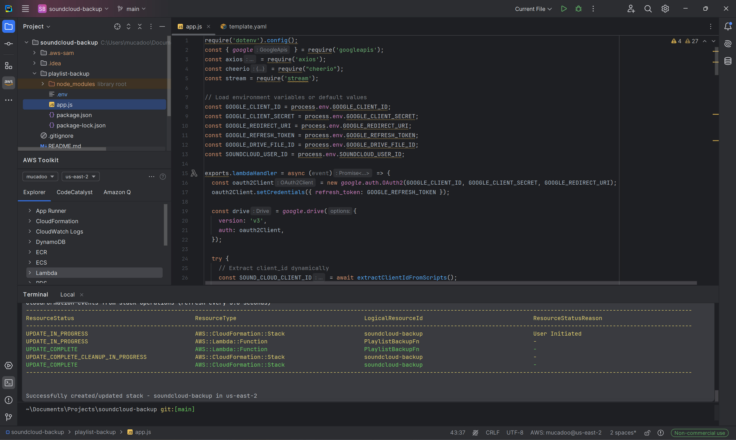 Applicazione serverless costruita con AWS Lambda per automatizzare il backup delle playlist SoundCloud su Google Drive. Il sistema integra Cheerio per parsing HTML, estrae dinamicamente il Client ID API di SoundCloud e usa Node.js per il fetch, l’aggiornamento e l’upload dei dati. Con architettura schedulata e scalabile, dimostra competenze in automazione via API, deployment serverless e gestione cloud dei dati.